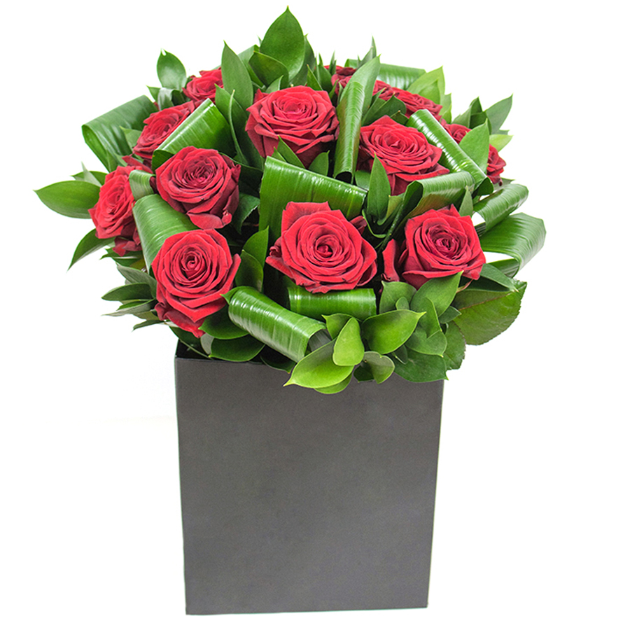 Immerse yourself in the captivating beauty of our stunning red rose and greenery bouquet. This exquisite arrangement combines vibrant red roses with lush aspidistra leaves and graceful ruscus, creating a unique and elegant display that enhances any environment.