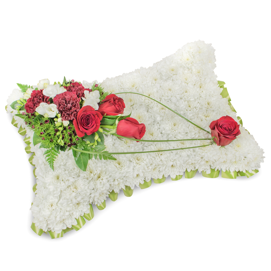 Express your condolences with our beautiful floral arrangement featuring white chrysanthemums, radiant red roses, sweet white freesias, and rich dark red carnations. Adorned with dianthus and bear grass, this bouquet offers a unique and heartfelt tribute.